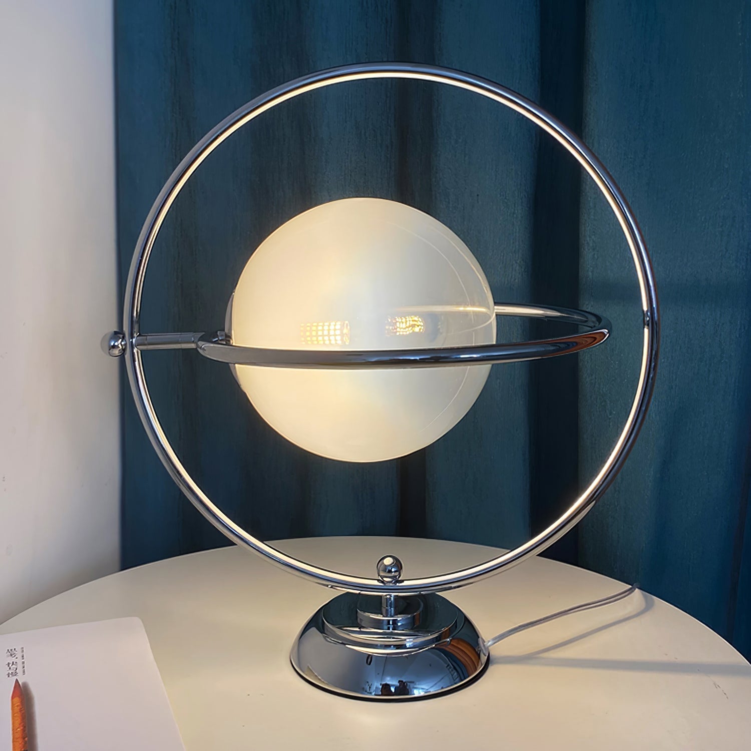 Inspired by the early phase of space exploration, the design of the CosmicGlow table lamp reflects the aesthetics of the space-age era. This lamp features a playful design that resembles a floating moon, with a metal ring and base. The ring can rotate 360 degrees, which is not only practical but also visually interesting and captivating.